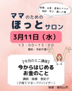 月一開催の無料ほっとサロンのご案内です。(PLANT3内キッズスペースで開催)